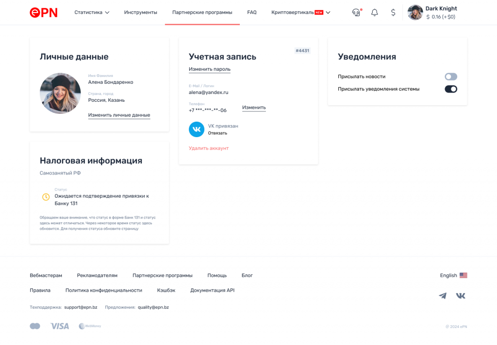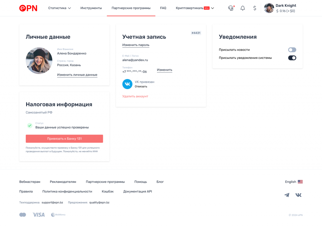 После обработки запроса в профиле ePN отобразится сообщение об успешной проверке и привязки к банку внутри ePN: