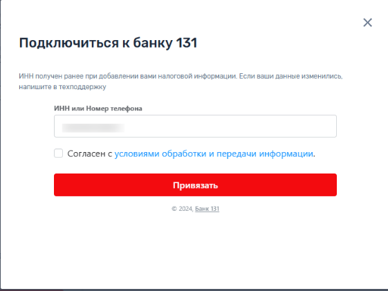 Нажмите на кнопку «Привязать к Банку 131», чтобы начать привязку. После этого отобразится модальное окно:
