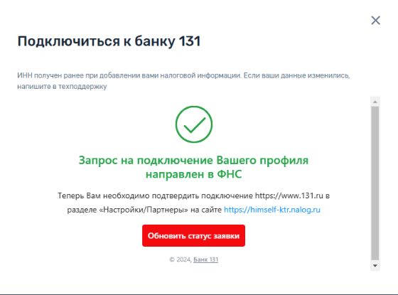 В модальном окне будет указан ваш ИНН из формы «Добавление налоговой информации». Нажмите на кнопку «Привязать» — так вы отправите запрос в ФНС на подключение профиля к Банку 131.