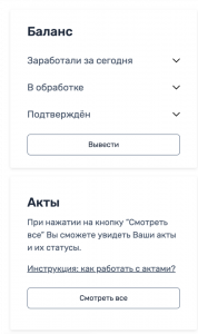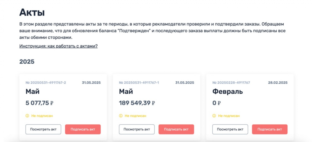 - Баланс «Подтвержден» будет обновляться только после подписания акта. Это необходимо, так как средства становятся доступными к выводу только после их документального оформления. Обращаем ваше внимание, что отсюда вытекает возможное увеличение холда. Однако, в каких-то случаях баланс “Подтвержден” будет обновляться раньше, чем это было до введения актирования.
