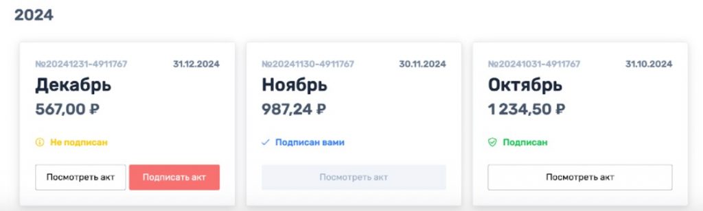 После акт будет подписан с нашей стороны — статус акта изменится на «Подписан» и акт снова можно будет посмотреть. Для смены статуса рекомендуем обновить страницу «Акты».